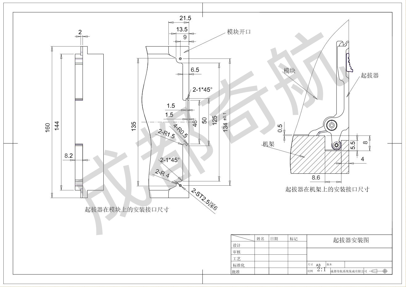 安裝模塊厚度不超過50mm,重量不超過3Kg;起拔器在模塊上的安裝螺釘采用GB819-85 M2.5×14的螺釘,緊固前應在螺紋上涂螺紋鎖固膠,安裝示意圖如下: